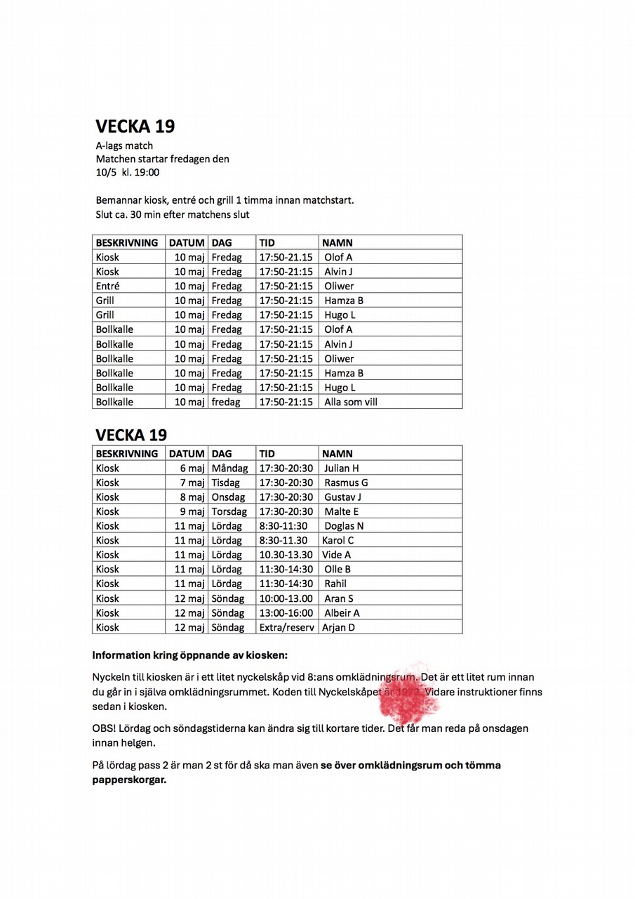 Om ni fått en tid ni inte kan eller får förhinder är det Ert ansvar att hitta en ersättare. Alla pass måste bemannas och det är hela lagets ansvar att se till att det blir så.